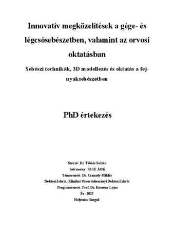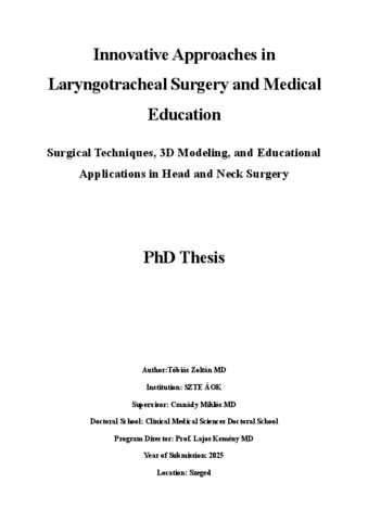 | Magyar cím: | Innovatív megközelítések a gége- és légcsősebészetben, valamint az orvosi oktatásban : Sebészi technikák, 3D modellezés és oktatás a fej-nyaksebészetben |