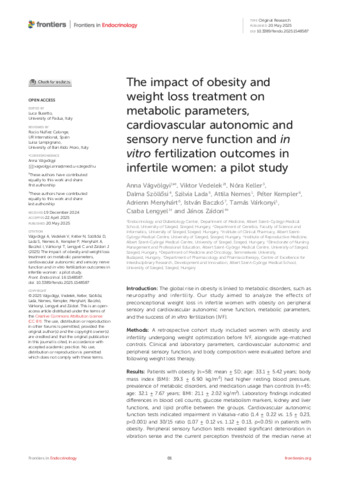 | Magyar cím: | Az elhízás és a testsúlycsökkentő terápia hatása a metabolikus paraméterekre, a kardiovaszkuláris autonóm és szenzoros idegi funkciókra, valamint az in vitro fertilizációs kezelés sikerességére elhízott nőbetegekben |