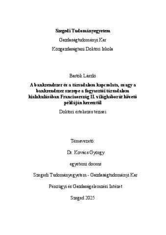 | Idegen nyelvű cím: | The Relationship between the Banking System and Society: The Role of the Banking System in the Development of Consumer Society in Post-World War II France |