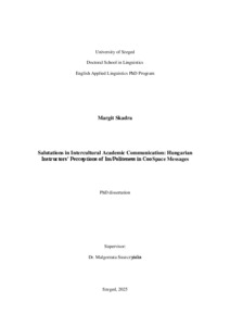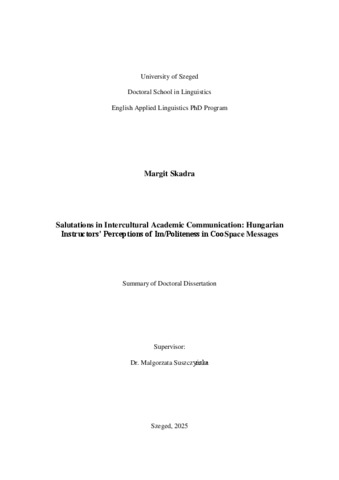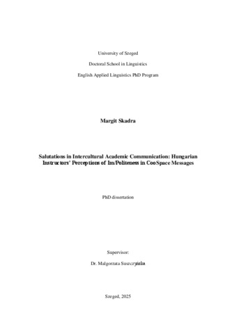 Written online communication has become an important channel of interaction in higher education, especially during the COVID-19 pandemic (Domonkosi & Ludányi, 2022). In that period, face-to-face communication in universities was often replaced by digital platforms such as CooSpace at the University of Szeged, where international medical students and Hungarian instructors communicated through written messages. This also affected the way of student-instructor interaction. The objective of the study is to investigate how international students use salutations in their CooSpace messages and how their instructors perceive them in terms of im/politeness. It is framed by intercultural pragmatics (Kecskes, 2013; 2016) and im/politeness research (Brown & Levinson, 1987; Culpeper, 2011; Kádár, 2017; Locher & Watts, 2005), fields that examine how im/politeness is negotiated in communication across different linguistic and cultural backgrounds. Most previous studies concentrated on how students write emails (Codina-Espurz & Salazar-Campillo, 2019; Eslami, 2013; Ko et al., 2015). Notably, Pap (2022) investigated international students’ emails in Hungary. However, only a limited number of studies have examined instructors’ perceptions (Economidou-Kogetsidis, 2011; Pinto, 2019; Savić, 2018). The research is based on 151 authentic CooSpace messages sent during the pandemic, together with instructors’ evaluations from a perception questionnaire (22 participants) and semi-structured interviews (13 participants). Data were analyzed using quantitative data analysis and qualitative content analysis. Through the three sources of data, the study explores what forms of salutations students use and how instructors perceive them. The findings show a wide range of variations: some students use highly formal salutations, others prefer informal or unconventional ones, and in some cases, salutations are missing altogether. Instructors evaluated these forms very differently. Titles and formal structures were usually viewed positively, while informal forms were perceived as impolite. At the same time, salutations in Hungarian, even if not perfectly appropriate, were often interpreted by the instructors as signs of cultural effort and respect. The interviews also highlighted how instructors reacted to perceived impoliteness and whether faculty-level guidelines would be helpful. The study contributes to the field of intercultural pragmatics, specifically to the investigation and understanding of im/politeness in intercultural communication. The findings suggest potential implications for student-instructor written communication: raising students’ awareness of academic salutation norms and providing institutional guidance could support clearer and more effective communication. Future research could broaden the focus beyond salutations in academic emails, such as closings or request strategies. It could also compare instructors’ perceptions across different institutions and cultural contexts.