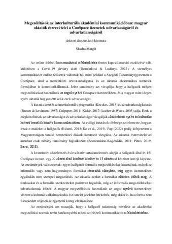 Az online írásbeli kommunikáció a felsőoktatás fontos kapcsolattartási eszközévé vált, különösen a Covid-19 járvány alatt (Domonkosi & Ludányi, 2022). A személyes kommunikációt online felületek váltották fel, mint például a Szegedi Tudományegyetemen a CooSpace, ahol a nemzetközi orvostanhallgatók és az oktatók elektronikus üzenetek formájában is kommunikálhatnak. Jelen tanulmány azt vizsgálja, hogy a hallgatók milyen megszólításokat használnak az angol nyelvű Coospace üzeneteikben, és a magyar mint idegen nyelv oktatók hogyan értékelik ezek udvariasságát. A kutatás keretét az interkulturális pragmatika (Kecskes, 2013) és az udvariasságkutatás (Brown & Levinson, 1987; Culpeper, 2011; Kádár, 2017; Locher & Watts, 2005) adja. Ezek a megközelítések az udvariasságot és udvariatlanságot vizsgálják a különböző nyelvi és kulturális hátterű beszélők közötti kommunikációban. Az eddigi kutatások többsége azt elemezte, hogyan írnak e-maileket a hallgatók (Eslami, 2013; Ko et al., 2015). Pap (2022) pedig kifejezetten a Magyarországon tanuló nemzetközi diákok üzeneteit vizsgálta. Az oktatók észrevételeivel azonban csak néhány tanulmány foglalkozott (Economidou Kogetsidis, 2011; Pinto, 2019; Savić, 2018). A kvantitatív adatelemzés és kvalitatív tartalomelemzés alapját a hallgatók által írt 151 CooSpace üzenet, egy 22 oktató által kitöltött kérdőív és 13 oktatóval készített interjú képezte. Az eredmények változatosak: egyes hallgatók formális megszólításokat használnak, mások az informális vagy nem hagyományos formákat részesítik előnyben, míg egyes üzenetekben egyáltalán nem szerepel megszólítás. Az oktatók ezeket a formákat eltérően ítélték meg. A titulusokat és a formális szerkezeteket pozitívan fogadták, míg az informális megszólításokat udvariatlannak ítélték. A magyar megszólítások használatát az angol nyelvű üzenetekben viszont a kulturális alkalmazkodás és tisztelet jeleként értékelték, még akkor is, ha a forma nem illeszkedett teljesen az egyetemi közeg elvárásaihoz. Az eredmények azt mutatják, hogy a hallgatói tudatosság növelése az akadémiai megszólítási normák terén hatékonyabbá teheti az írásbeli kommunikációt a felsőoktatásban.