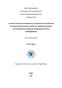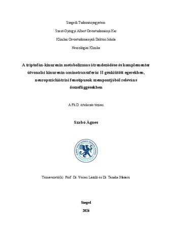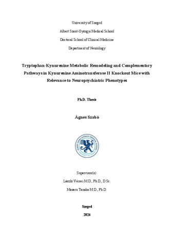 | Magyar cím: | A triptofán-kinurenin metabolizmus átrendeződése és komplementer útvonalai kinurenin-aminotranszferáz II génkiütött egerekben, neuropszichiátriai fenotípusok szempontjából releváns összefüggésekben |