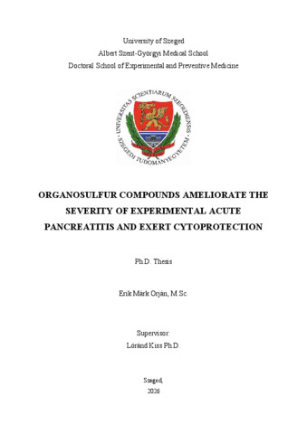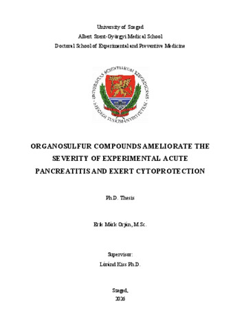 | Magyar cím: | A kénorganikus vegyületek enyhítik a kísérletes akut pancreatitis súlyosságát és citoprotektív hatást fejtenek ki |
